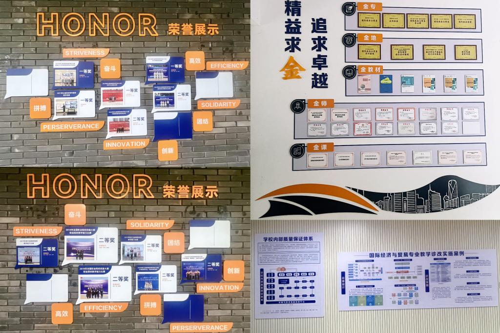学院通过打造质量文化墙,展示近几年在专业、课程、教材、教师竞赛、学生竞赛、基地建设等方面取得的成绩和荣誉,激励学院师生在现有基础上,以“金专、金地、金教材、金师、金课”标准持续建设“五金”成果,继续秉承精益求“金”的宗旨,砥砺奋进、追求卓越。同时,以国际经济与贸易专业教学诊改作为案例普及诊改知识,介绍学校“55821”诊改基本框架。