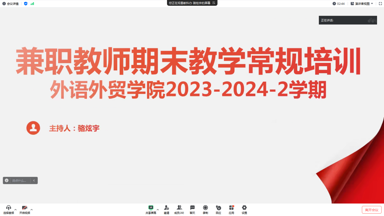 7月5日下午,外语外贸学院组织开展兼职教师期末教学常规培训,学院教学副院长杨信、教科办成员、全体兼职教师及兼职教师助理教师出席了本次会议。
