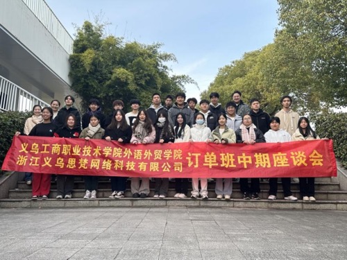 12月5日,外语外贸学院组织召开2023级思梵现代学徒制订单班中期座谈会。浙江义乌思梵网络科技有限公司董事长刘玲、总经理朱彦炜、外语外贸学院国际商务专业机构负责人、订单班班主任及2023级全体订单班学生出席。