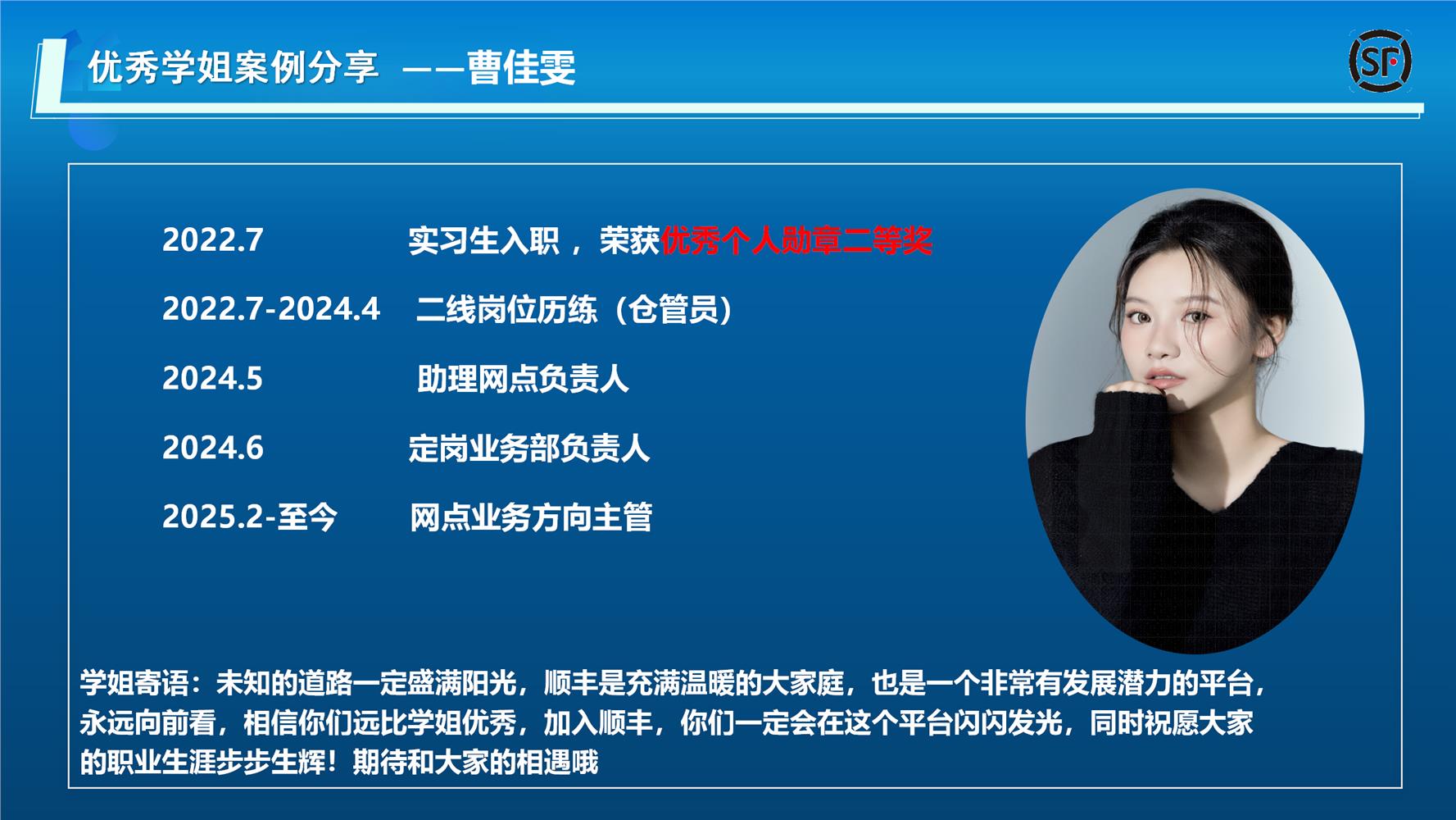 原计划安排20物流1班毕业的学姐曹佳雯前来宣讲,但由于当天与客户商谈耽搁了,最后由何经理进行了介绍,号召拟入职顺丰的同学向学姐学习。