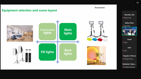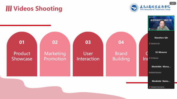 本次研习班由义乌工商职院外语外贸学院副教授黄艺、创业导师吴忠齐、熊艾莎、吕一凡老师进行线上全英文授课,老师们以理论与实践相结合的方式,全方位展示了义乌电商行业的发展魅力,为远在南非的学员提供了关于跨境电商的最新知识和实践技能。根据学员所处背景差异,还因材施教,有针对性地选择课程内容直击痛点,突破运营困难。熊艾莎老师以“跨境电商的发展现状和趋势”为题,通过大量的数据和案例,展示了中国跨境电商行业的迅猛发展和巨大潜力,详细介绍了义乌作为全球小商品集散地的独特优势。吴忠齐老师介绍了直播营销的基本概念和原理,详细讲解了如何制定直播营销策略、如何吸引观众、如何提升转化率等实用技巧。吕一凡老师紧密结合南非当地商贸环境,深入解析TikTok的运作机制,还分享了一些实用的直播工具和技巧,帮助学员们迅速提升直播技能。黄艺老师向学员讲授了如何打造有吸引力的直播间,如何撰写直播脚本,剖析了一些成功的TIKTOK直播引流案例,指出了TikTok直播流量的秘密。