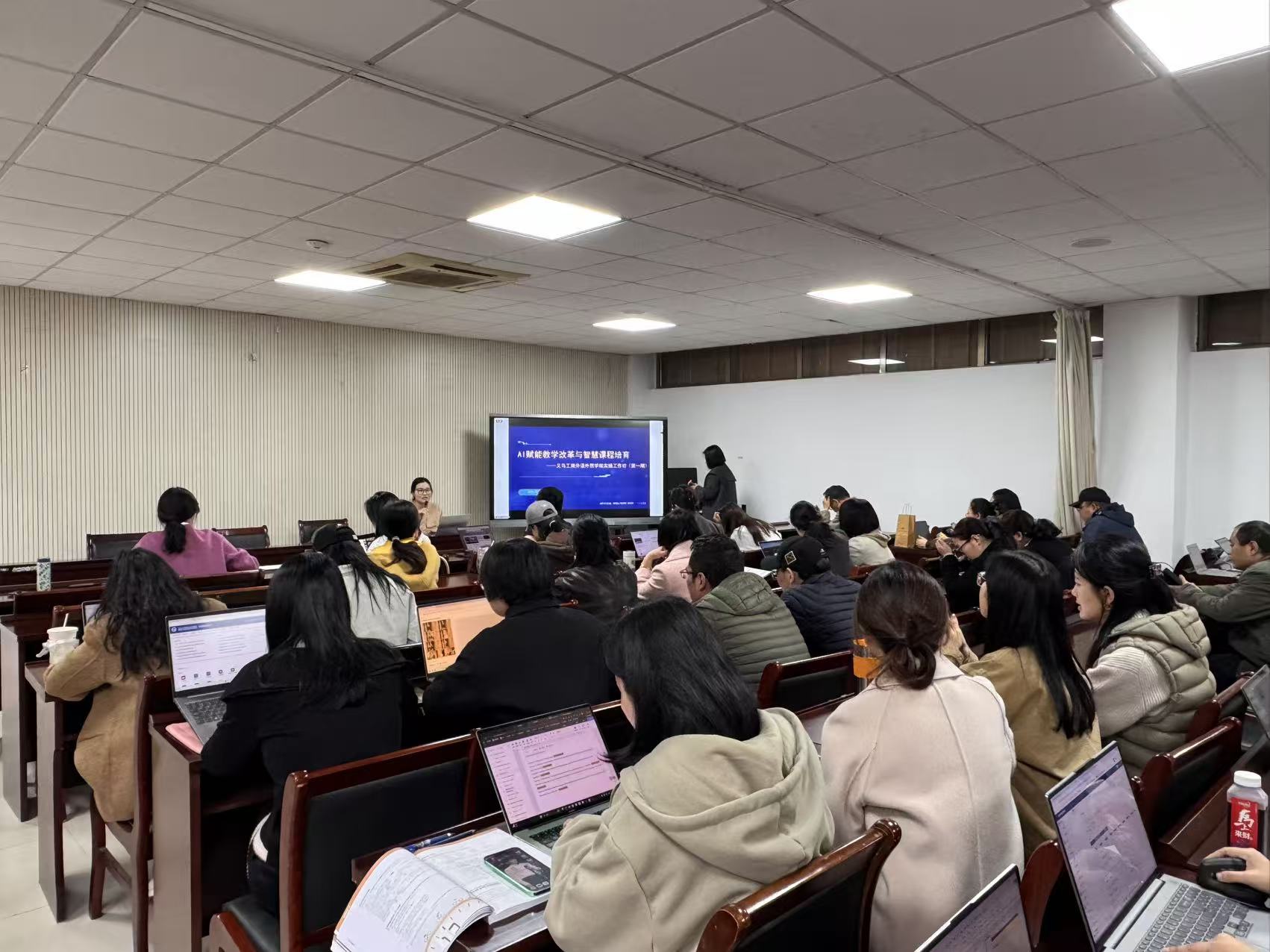 培训过程中,胡经理注重理论与实操结合,通过现场演示、案例拆解、互动答疑等方式,帮助教师快速掌握平台使用技巧,清晰讲解了如何借助AI工具优化教学设计、丰富教学场景,让智能技术真正融入“备课-授课-实践-评估”全流程。参与教师认真聆听、积极互动,就教学中遇到的平台操作难题主动提问,现场学习氛围浓厚。