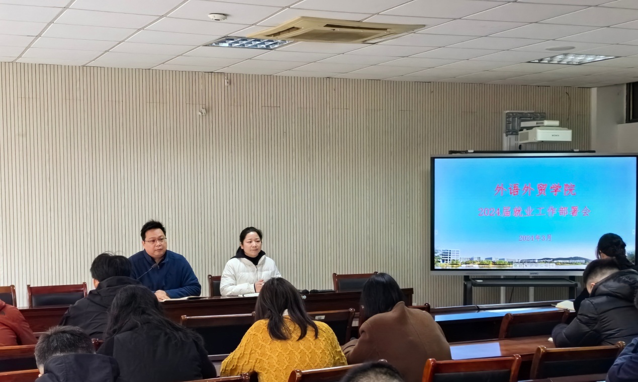 3月13日,外语外贸学院在学院会议室召开学院2024届毕业生工作部署会议,学院党委副书记、学工办主任、就业辅导员和全体2024届班主任参加会议。
