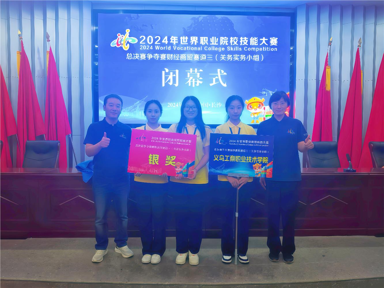 10月28日至31日,2024年世界职业院校技能大赛总决赛争夺赛关务实务赛项在长沙航空职业技术学院举行,共有来自全国56所院校的选手同台竞技。经过激烈角逐,我校外语外贸学院朱简、叶丽芳老师指导的孙羽希、吴星雨、王思佳团队荣获银奖。