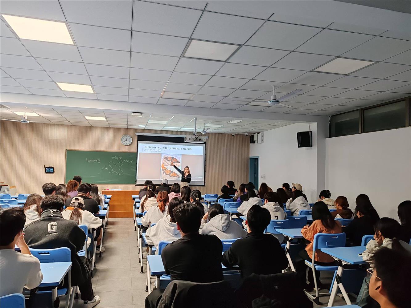 在讲座中,Claudia结合丰富的视频和图片徐徐展开相关内容,并且使用西英中三语进行讲解,充分照顾到了不同水平的西语学生。此次讲座让学生们进一步了解了蝴蝶的特性,拓宽了学生的知识面。