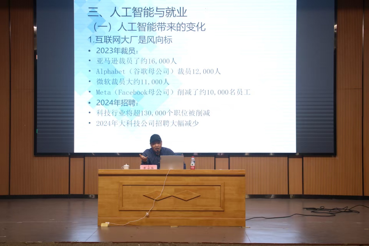 贾少华教授在讲座上深入分析了前沿人工智能技术的演进历程和功能特点,详细生动解读了人工智能技术对国内外就业创业形势的影响和冲击,分享了自身经历及身边优秀学子的创业成功案例,深刻剖析了人工智能时代大学生就业创业的机遇和挑战,还给参会大学生提供了很多前瞻性的思考和建议。