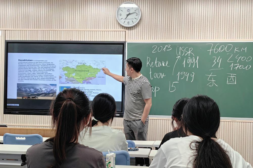 在讲座的开头,Dos博士满怀深情地介绍起他美丽的家乡——哈萨克斯坦。作为中亚的重要门户,这片广袤的土地承载着2013万人民的梦想与希望。它宛如文化交融的“十字路口”,东西方文明在此交汇碰撞,形成了独特而多元的文化景观。Dos博士着重描绘了首都阿斯塔纳与直辖市阿拉木图这两座城市的迷人画卷。阿斯塔纳以现代感十足的建筑群落彰显着蓬勃生机;阿拉木图则将雪山与都市完美融合。同学们在Dos博士的讲述中,仿佛身临其境,对哈萨克斯坦有了更为立体而深刻的认识。