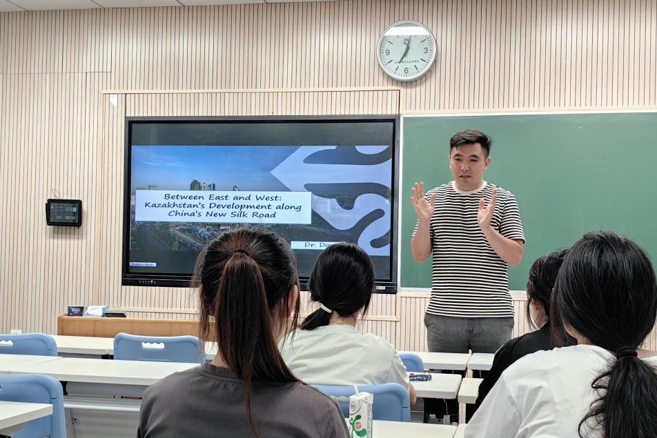 2025年6月10日晚,由国际合作与交流处主办,外语外贸学院承办的“哈萨克斯坦在中国新丝绸之路上的发展”主题讲座在春晗楼210教室顺利举办。此次讲座邀请了国际经济与贸易专业教师Dos博士作为主讲嘉宾,面向全校师生开展。