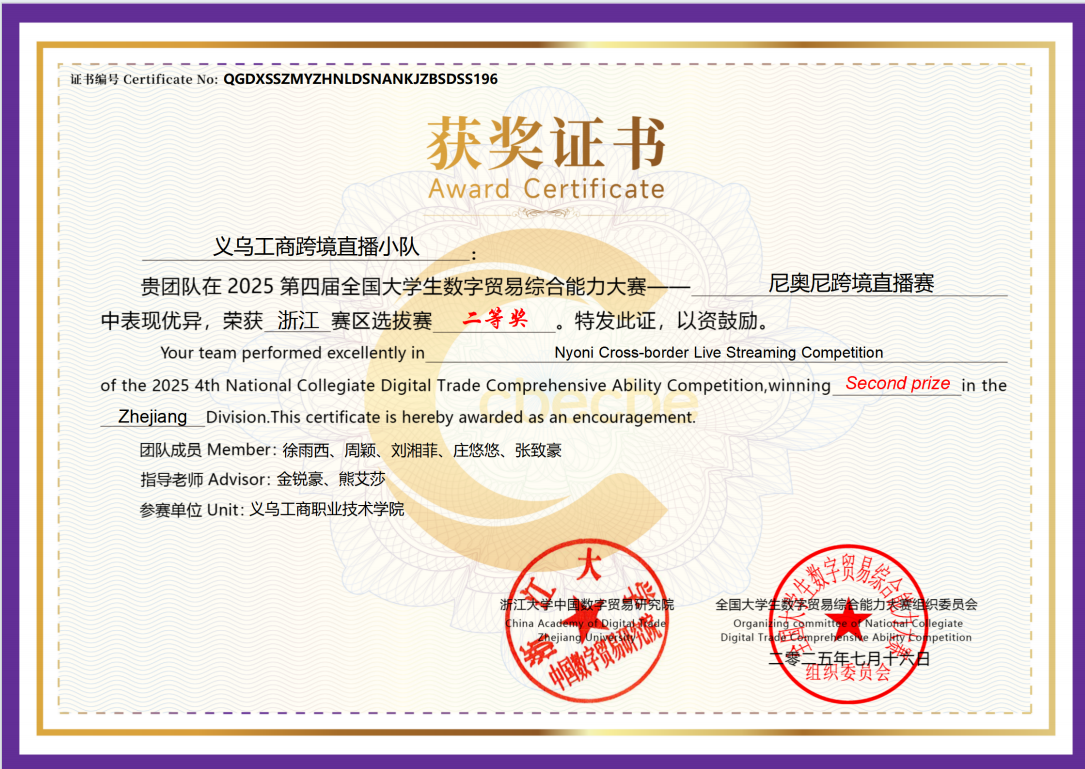 近日,2025年第四届全国大学生数字贸易综合能力大赛浙江赛区选拔赛结果正式公布。由外语外贸学院金锐豪、熊艾莎老师指导,徐雨西、周颖、刘湘菲、庄悠悠、张致豪五位同学组成的“义乌工商跨境直播小队”(团队ID: 5535)凭借出色的表现,荣获尼奥尼数字贸易跨境直播赛道二等奖。